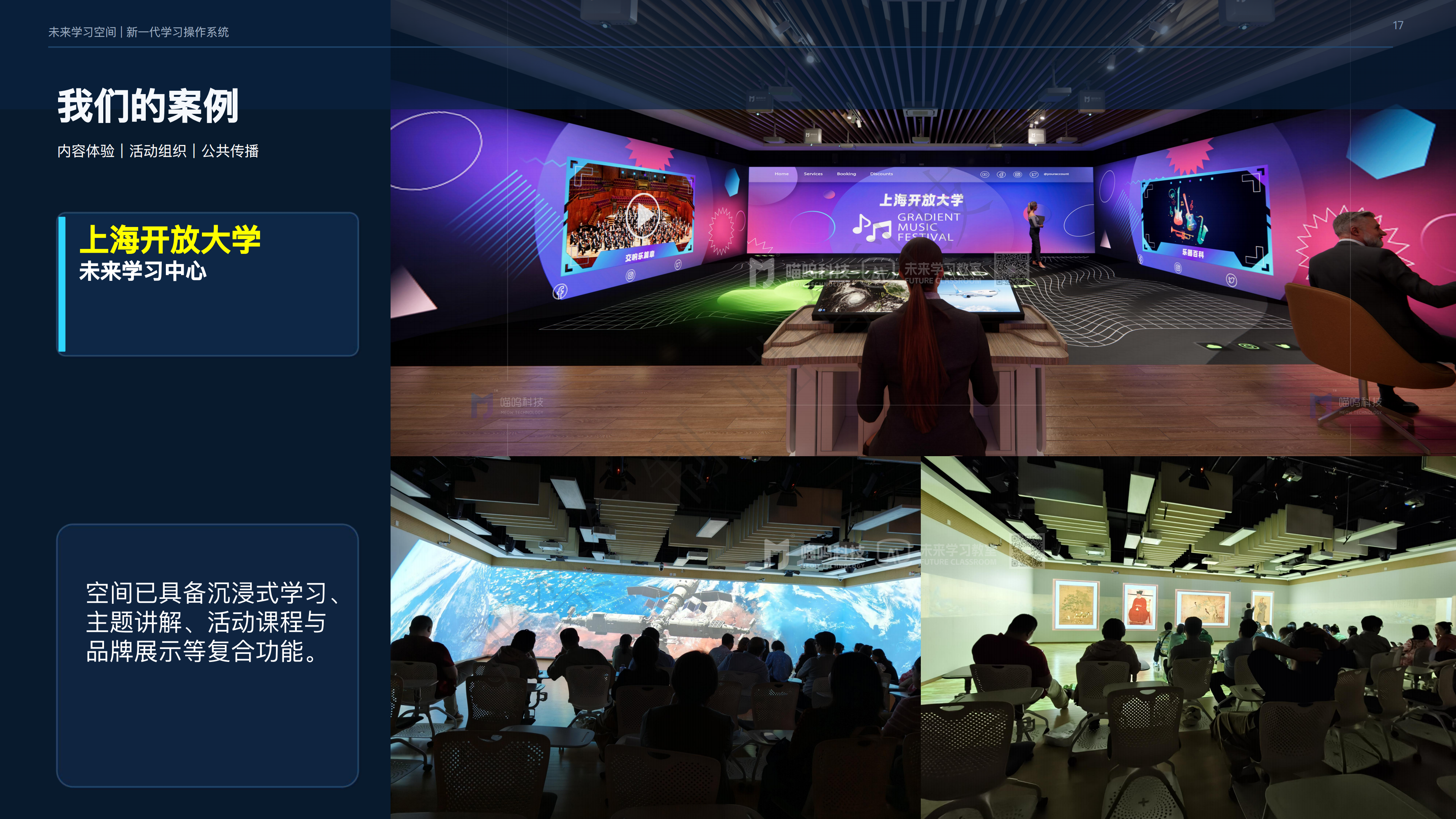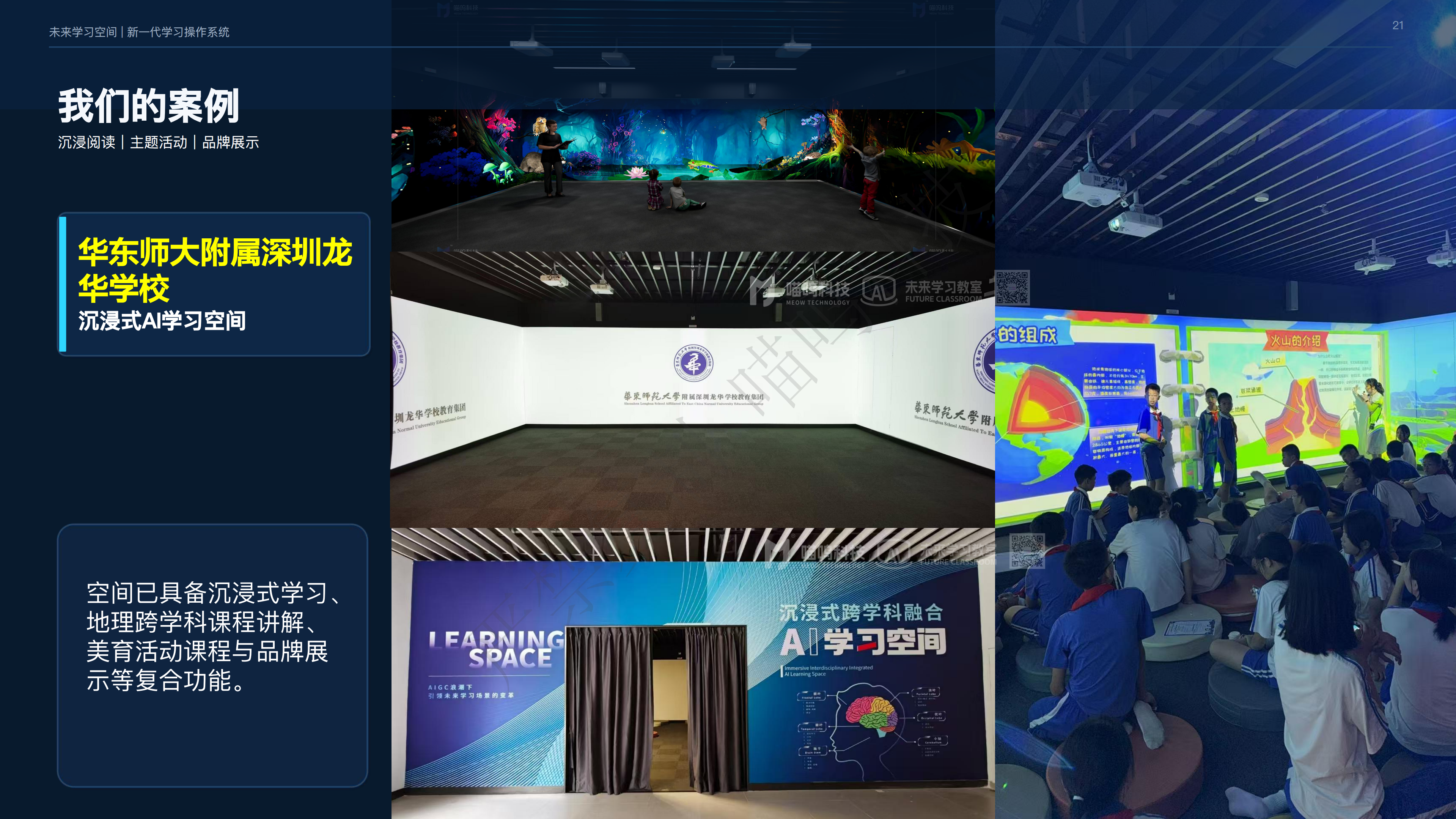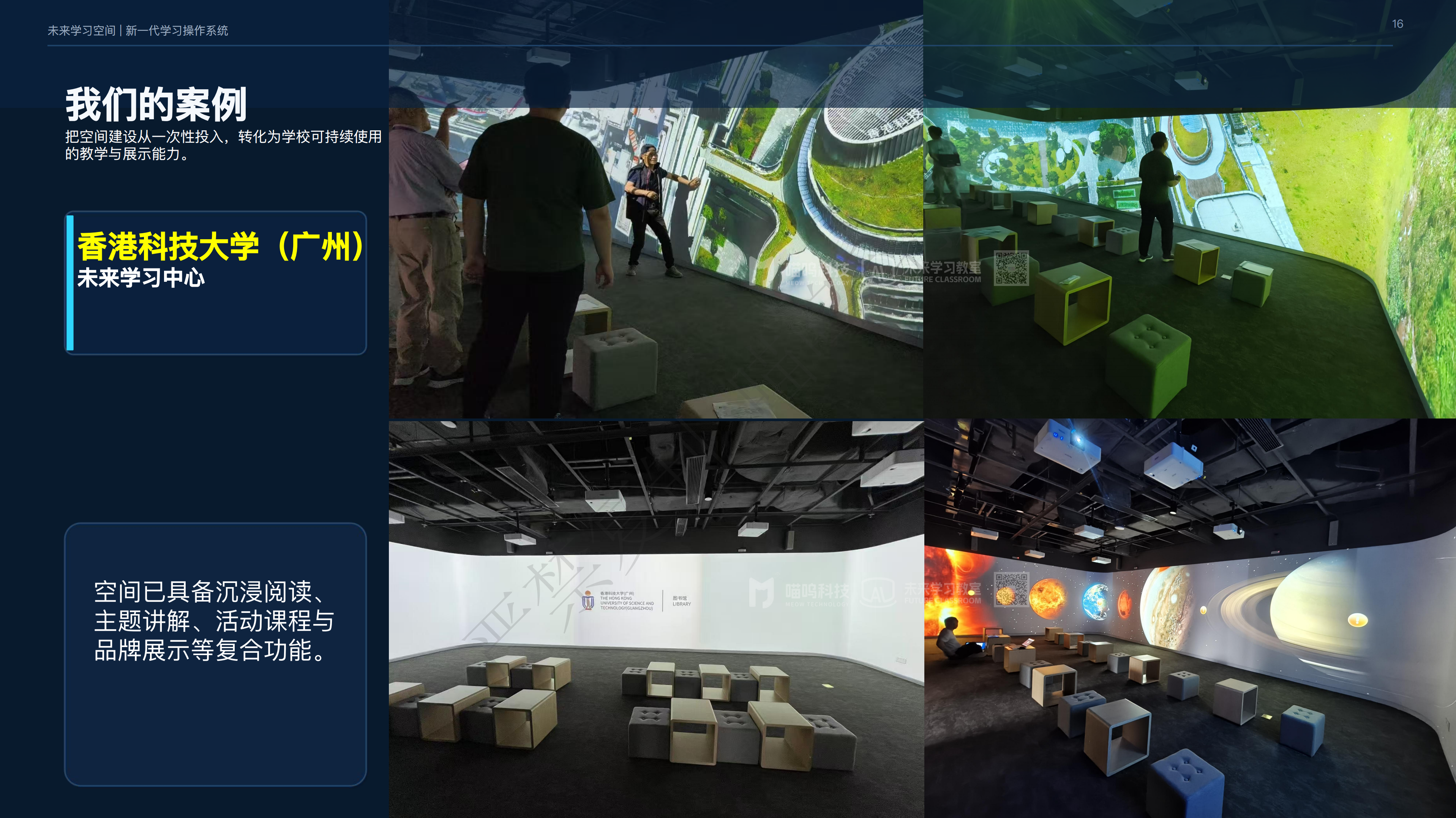 课堂教学|课程建设|品牌展示|成果汇报 - 共用同一套空间能力底座;一套系统覆盖多种应用场景,可覆盖 K12 跨学科教室、高校未来学习中心、公共图书馆、非遗文化、高新技术培训等应用场景,让未来学习空间真正成为可持续运营的学习生产力。